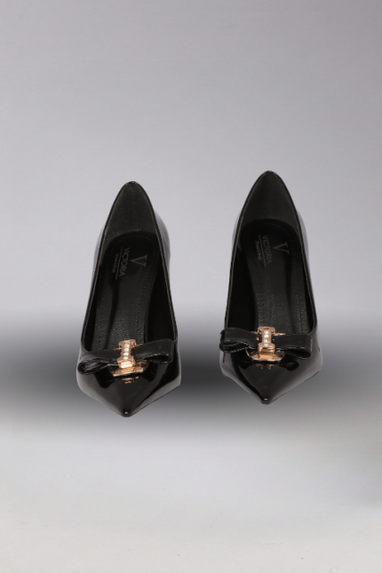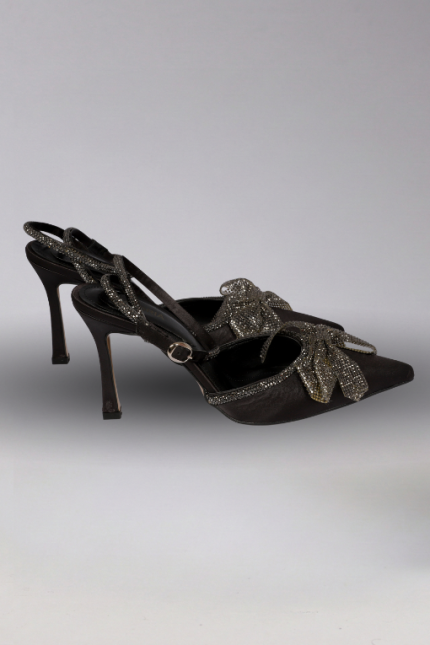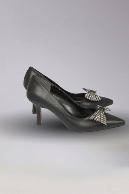 Taşlı Kurdeleli Siyah Mat Deri Abiye Ayakkabı
