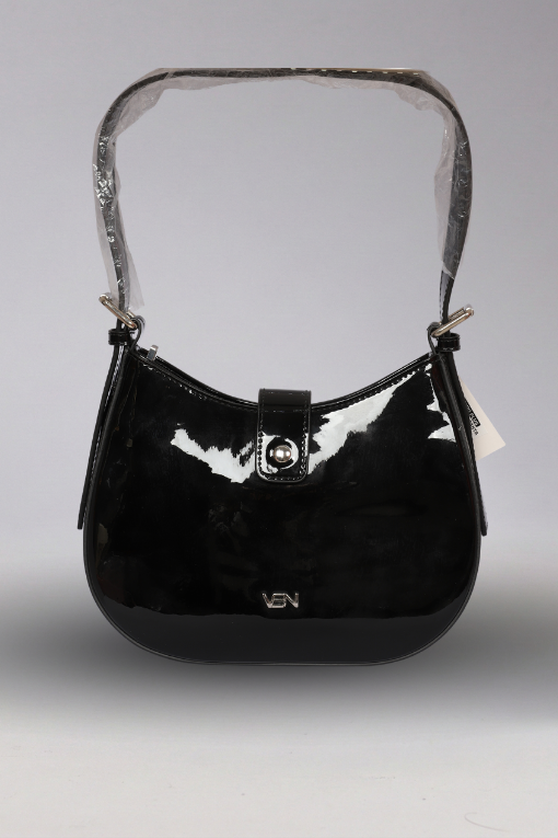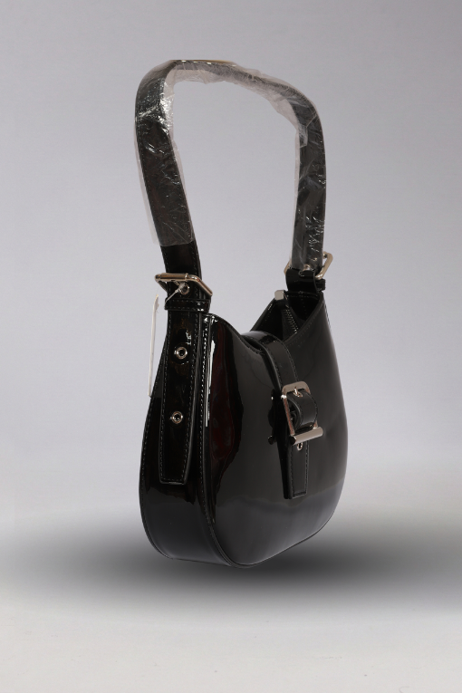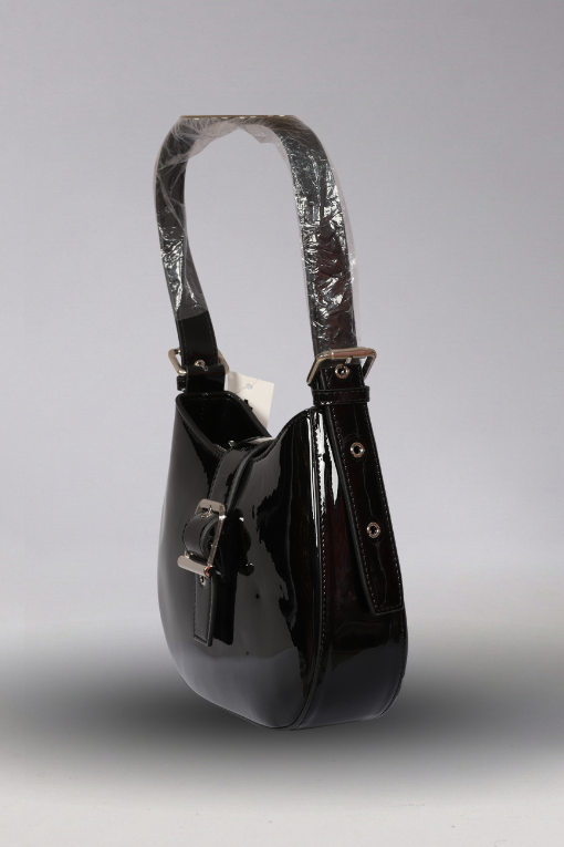 Kemer Detaylı Parlak Siyah Baget Çanta